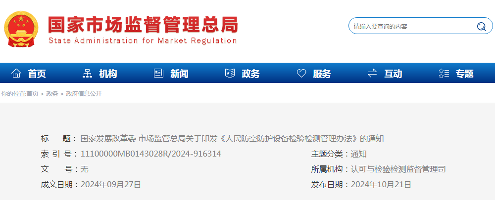 人民防空防護(hù)設(shè)備檢驗(yàn)檢測(cè)管理辦法 印發(fā)國(guó)家發(fā)展改革委 市場(chǎng)監(jiān)管總局關(guān)于印發(fā)《人民防空防護(hù)設(shè)備檢驗(yàn)檢測(cè)管理辦法》的通知發(fā)改國(guó)防規(guī)〔2024〕1450號(hào)各省、自治區(qū)、直轄市、新疆生產(chǎn)建設(shè)兵團(tuán)發(fā)展改革委、市場(chǎng)監(jiān)管局、國(guó)防動(dòng)員(人民防空)辦公室:為加強(qiáng)人民防空防護(hù)設(shè)備檢驗(yàn)檢測(cè)管理,確保人民防空防護(hù)設(shè)備的各項(xiàng)功能得到正常發(fā)揮,依據(jù)《中華人民共和國(guó)產(chǎn)品質(zhì)量法》《中華人民共和國(guó)人民防空法》《檢驗(yàn)檢測(cè)機(jī)構(gòu)資質(zhì)認(rèn)定管理辦法》等有關(guān)法律法規(guī),我們制定了《查看詳情>>