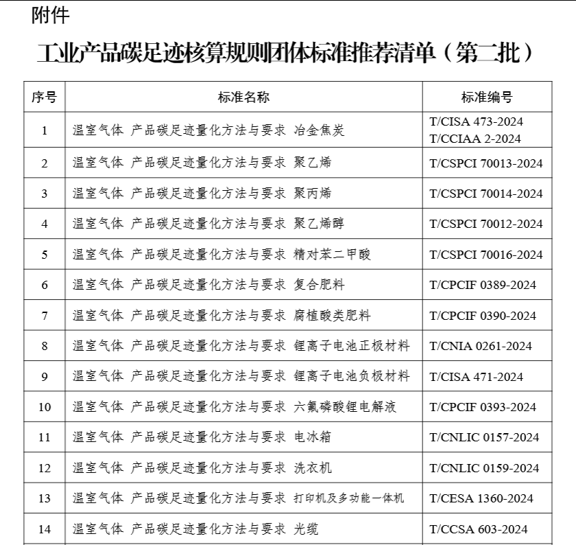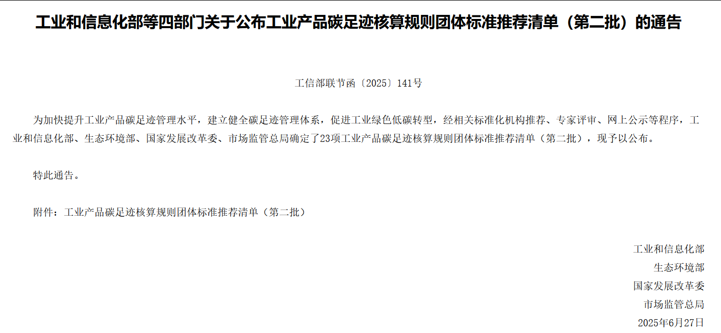 工業和信息化部等四部門關于公布工業產品碳足跡核算規則團體標準推薦清單(第二批)的通告